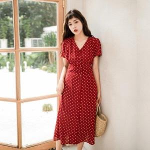 わずか 赤 ワンピース ドット 水玉 ワンピース ブラウス マキシ フレア スカート ボタン 花柄 Loveysmileshop